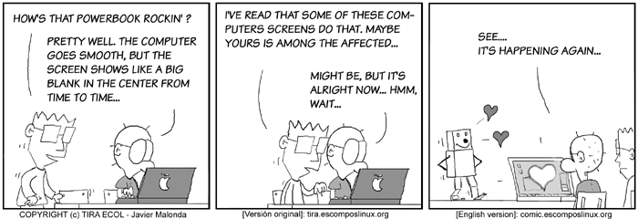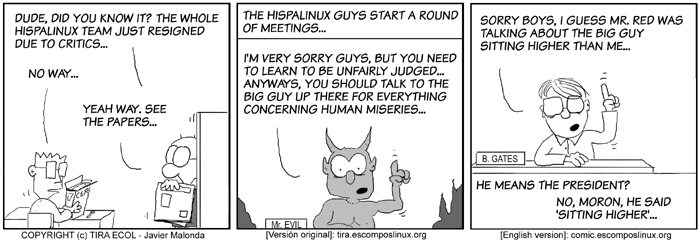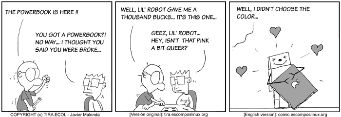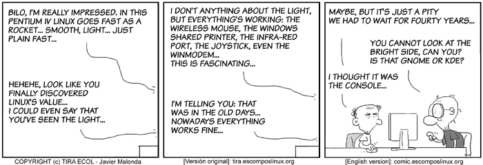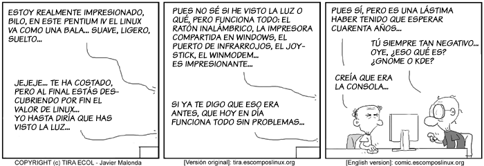 The Ecol comic strip is written for escomposlinux.org (ECOL), the web site that supports es.comp.os.linux, the Spanish USENET newsgroup for Linux. The strips are drawn in Spanish and then translated to English by the author.