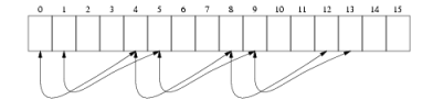Now we change the program a bit. Suppose we have a cache block of size M bytes. We think of main memory as being divided into blocks of size M bytes each. Reading the zero'th byte would result in bytes 0 to M-1 getting stored in a cache block. If the next M-1 accesses refer to locations 1 to M-1, then the references would be satisfied from the cache. But what if the next referenced element is the one at main memory address M? Because only elements 0 to M-1 are in the cache, we have a miss, and another M byte block gets loaded into the cache (the block from M to 2*M-1). If we keep on accessing this way (ie, 0, M, 2*M, 3*M etc), each access will result in a cache miss. If the array is fairly large compared to the cache size, we would very soon fill up the cache. Now, if we come back and try to read from locations 1, M+1, 2*M+1, 3*M+1 etc, these elements would no longer be in the cache as they have been replaced by elements present at the far right end of the array - and so we again have cache misses. The figure below shows this kind of access for M=4.