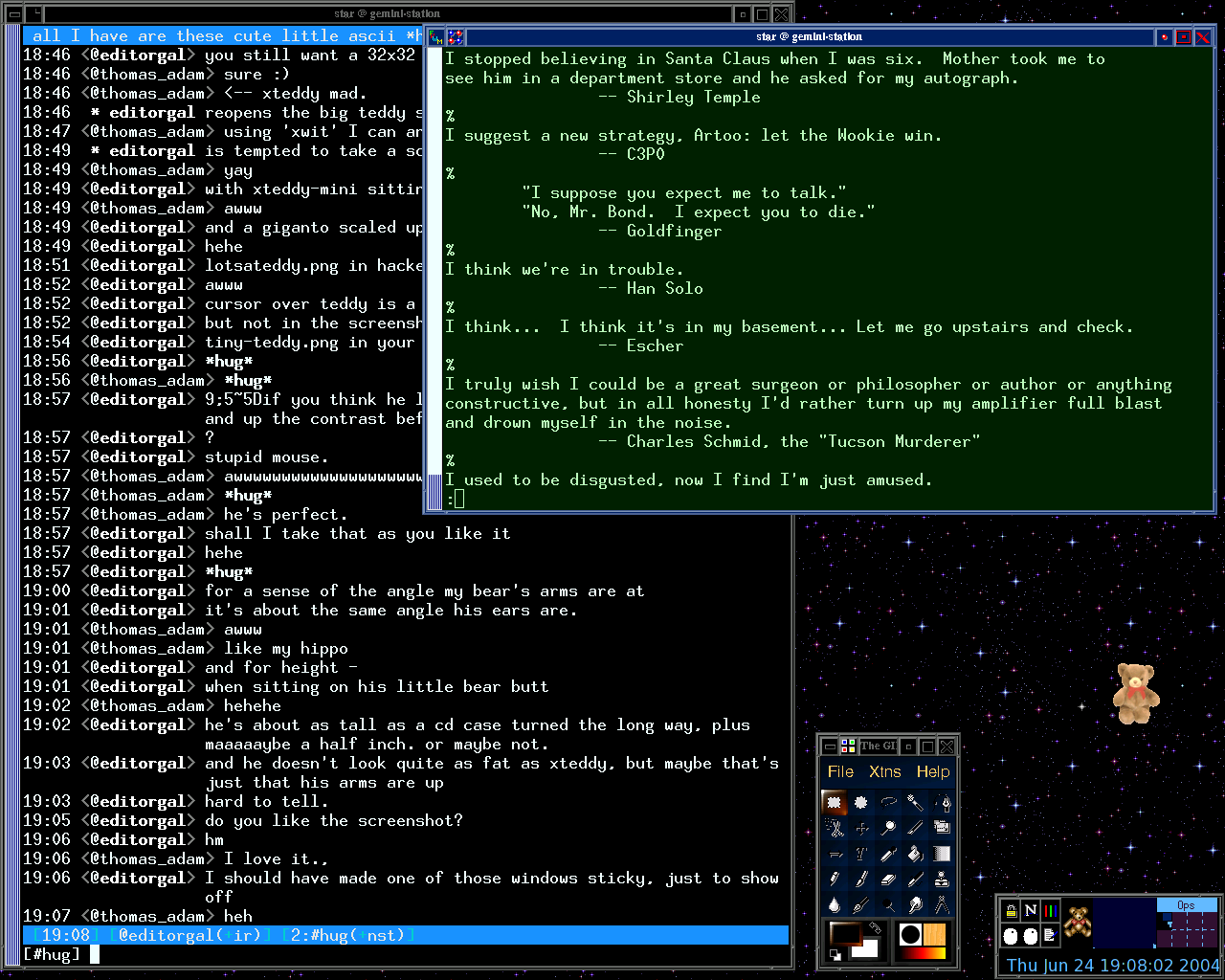 Did I miss anything? Oh of course. A screen shot It's a bit on the large side, but I told you I had a big monitor. That dark shot of the GIMP is also a goodie of mine, a GTK theme I whipped up for myself which I call DarkGems, because I stole gemlike features from a half dozen E and GTK themes. But this is about Fvwm, not about GTK, so I'll save that for another time.
