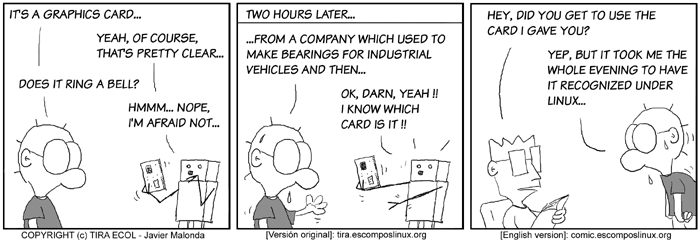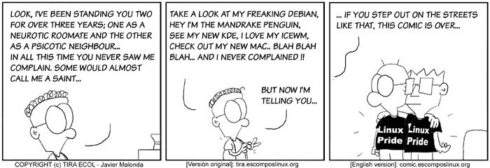 The Ecol comic strip is written for escomposlinux.org (ECOL), the web site that supports es.comp.os.linux, the Spanish USENET newsgroup for Linux. The strips are drawn in Spanish and then translated to English by the author.