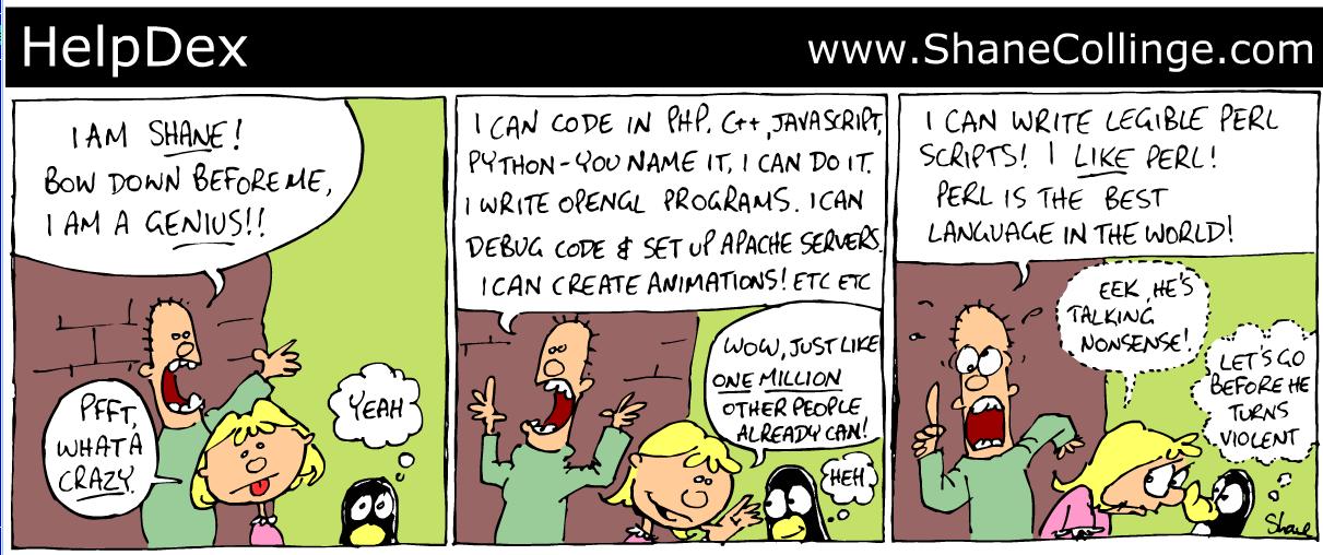 [BIO] Part computer programmer, part cartoonist, part Mars Bar. At night, he runs around in a pair of colorful tights fighting criminals. During the day... well, he just runs around. He eats when he's hungry and sleeps when he's sleepy.