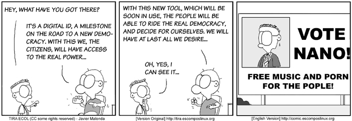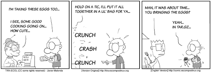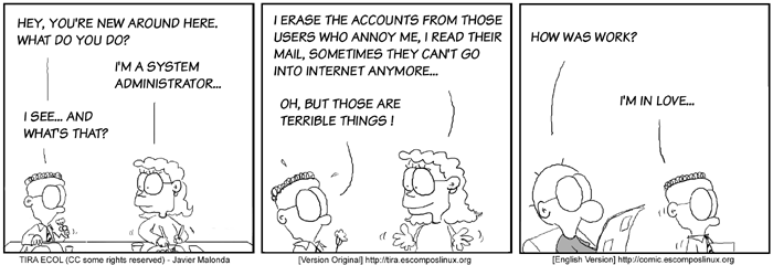 The Ecol comic strip is written for escomposlinux.org (ECOL), the web site that supports es.comp.os.linux, the Spanish USENET newsgroup for Linux. The strips are drawn in Spanish and then translated to English by the author.