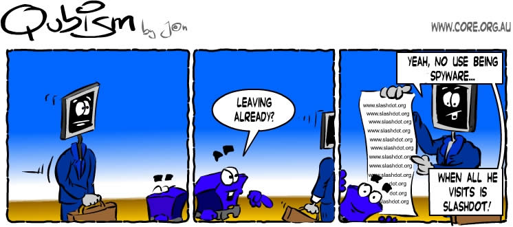 [BIO] Jon is the creator of the Qubism cartoon strip and current Editor-in-Chief of the CORE News Site. Somewhere along the early stages of his life he picked up a pencil and started drawing on the wallpaper. Now his cartoons appear 5 days a week on-line, go figure. He confesses to owning a Mac but swears it is for "personal use".