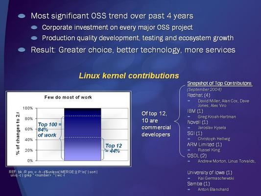 - and added a slide showing the 10 top contributors to the Linux kernel, with 8 of those being engineers employed at major IT corporations. Finally, he pointed out a link on the MSDN web site summarizing Redmond's position on SSSw.
