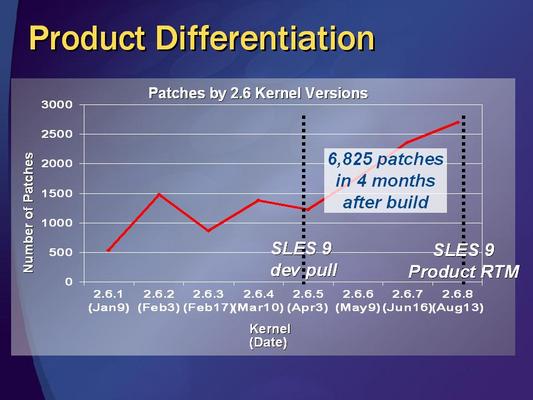 Among the slides and varied commentary, Matusow cited the complexity of a major OS which may require large companies [or a large community] for support, and pointed out that, historically, patch numbers go up over time and as versions progress [i.e., Linux patching will eventually become more like MS patching]. So the increasing patching "... demonstrates the amount of engineering effort from Novell and Red Hat." He demonstrated 2 graphs as supporting evidence -