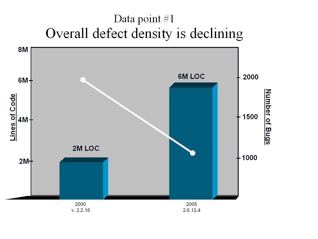 He presented a lot of statistical data: security vulnerabilities go up with more code (but Linux seems to mostly reverse this), developers spend about 40% of their time on reworking buggy code, the vast majority of security flaws are from detectable bugs not caught by limited test cases, etc. One key result: Linux was very good in comparison with commercial software of its size and complexity.