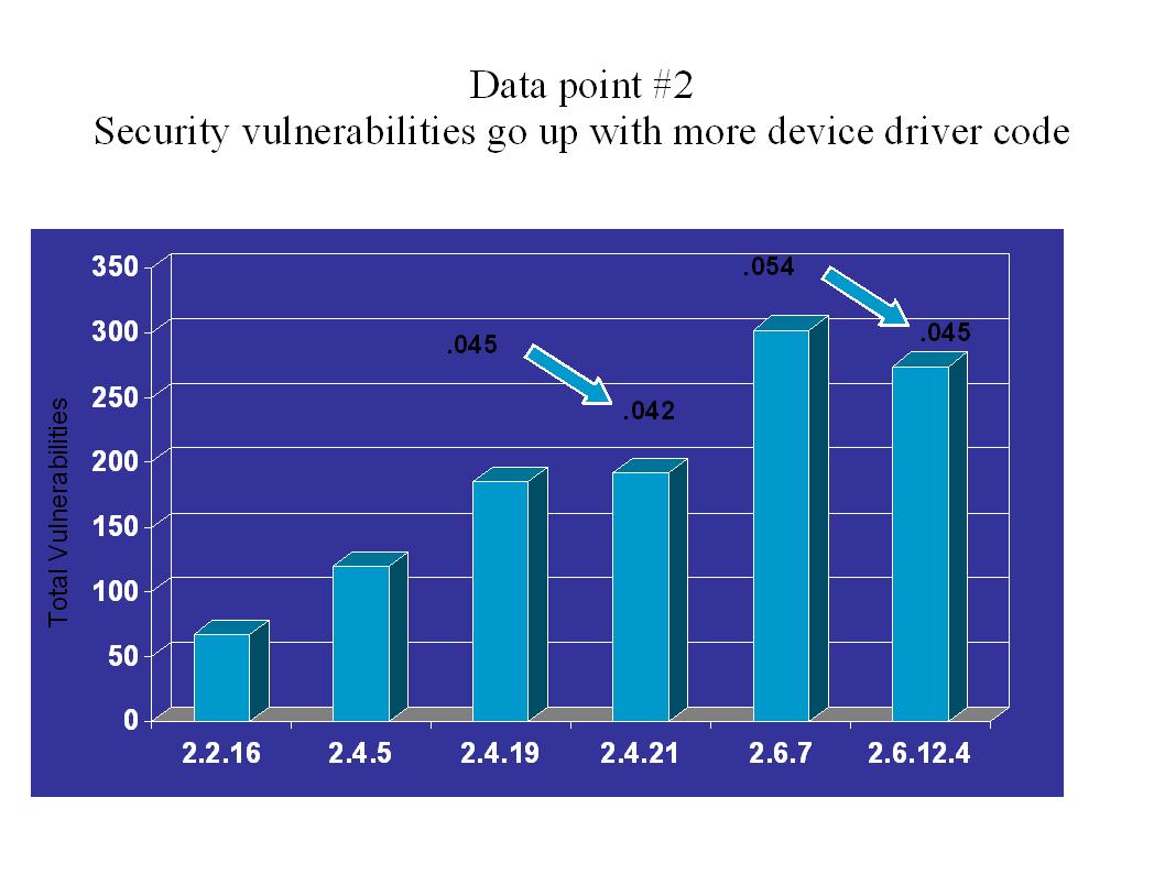 Two slides about defects in Linux code (security vulnerabilities go up with more device driver code):