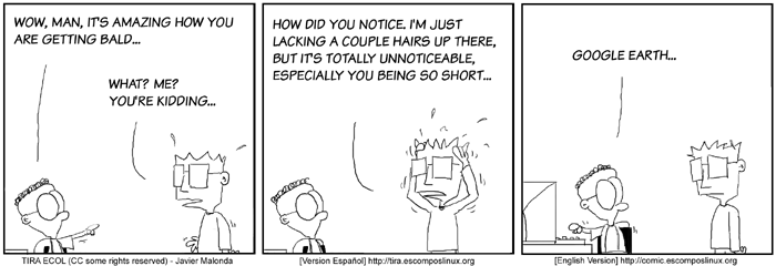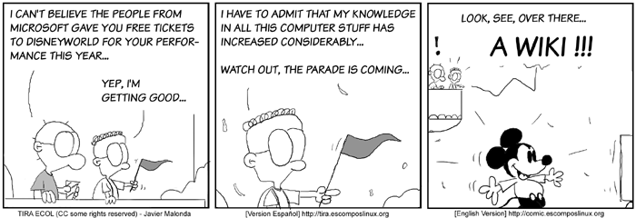 The Ecol comic strip is written for escomposlinux.org (ECOL), the web site that supports es.comp.os.linux, the Spanish USENET newsgroup for Linux. The strips are drawn in Spanish and then translated to English by the author.