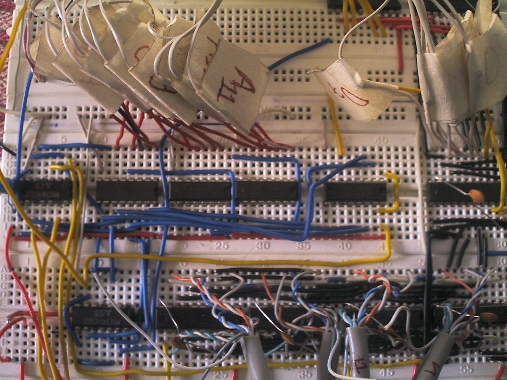 There are lots of other debugging techniques which you will probably discover by yourself when you run into problems. Try to ensure that the wiring at the connector that goes into the ISA slot is correct. We checked every part of the device (every IC, all those jumper wires, etc.) and after debugging for about a week we found that IOW and IOR wires were connected to the wrong pins in the ISA slot. So, recheck the wiring. Fortunately, we did not mistake the 12V pin for a 5V pin! ;)