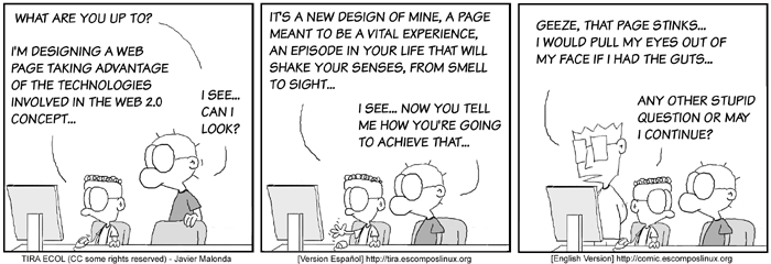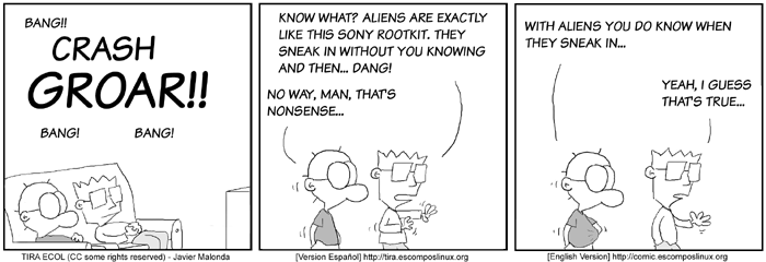 The Ecol comic strip is written for escomposlinux.org (ECOL), the web site that supports es.comp.os.linux, the Spanish USENET newsgroup for Linux. The strips are drawn in Spanish and then translated to English by the author.