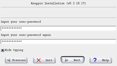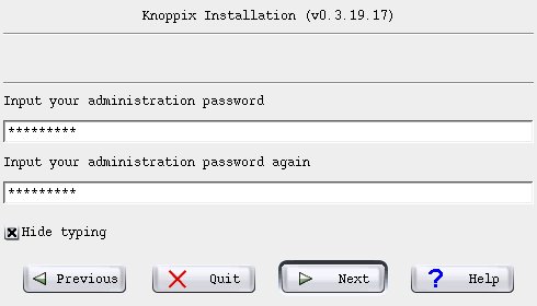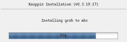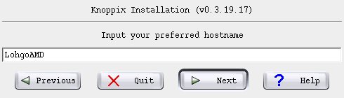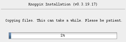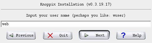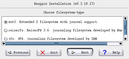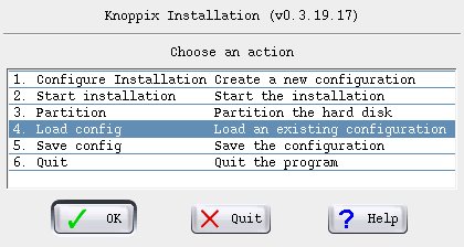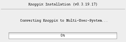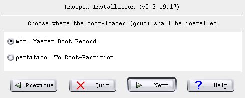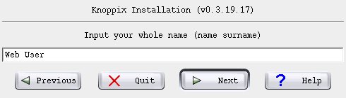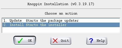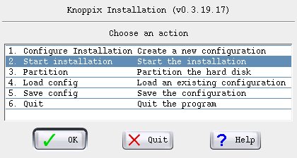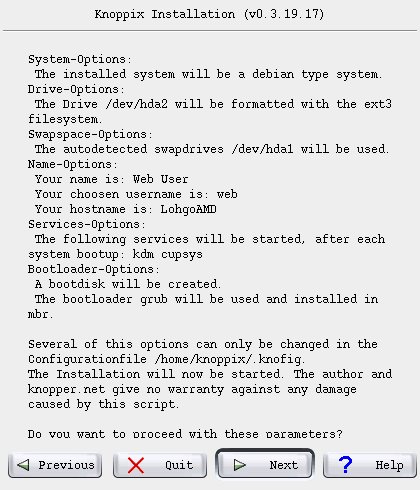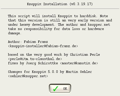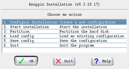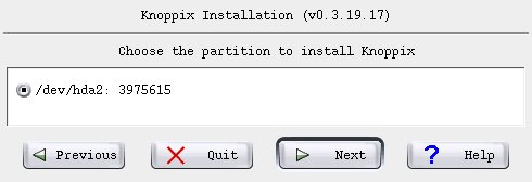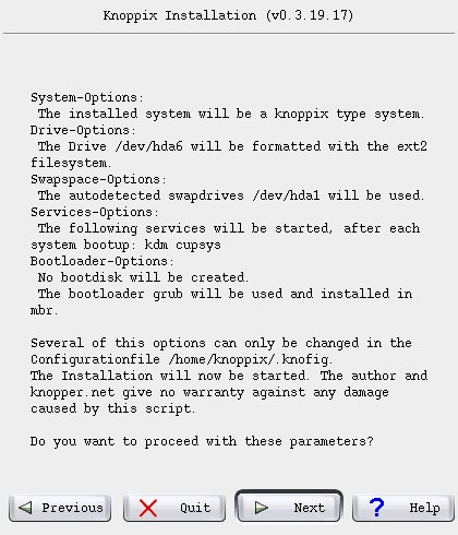 One of the nice things about using Knoppix is that installation does not take place in an unfamiliar and restricted environment; it is done through a script that runs after having booted Knoppix. In other words we have a familiar Linux environment, multiple windows and virtual terminals, and should the need arise, can do something that wasn't anticipated without having to cancel the installation and start over.