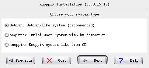 Initially I had tried to choose 'Knoppix' since I knew it from CD - but ran into problems. Debian worked fine, despite being the so-called "unstable" version.