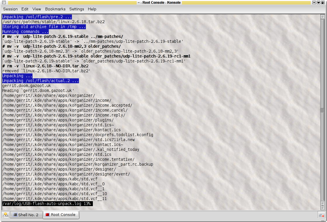 At the very least, use some form of authorization; a simple, but efficient, variant is presented below. The automatic unpack script is a standard SysV init script; place or symlink it into /etc/init.d and create a symlink for the appropriate runlevel. (On my Debian box, I use /etc/rc2.d/S30unpackUSB, RH/Fedora are similar and there is chkconfig support.) When invoked with the `start' argument at boot-time, the script will: