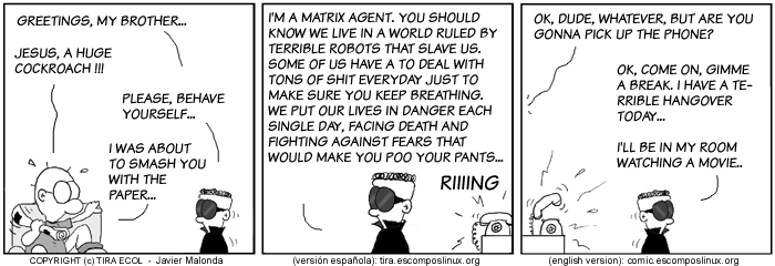 The Ecol comic strip is written for escomposlinux.org (ECOL), the web site that supports es.comp.os.linux, the Spanish USENET newsgroup for Linux. The strips are drawn in Spanish and then translated to English by the author.These images are scaled down to minimize horizontal scrolling.