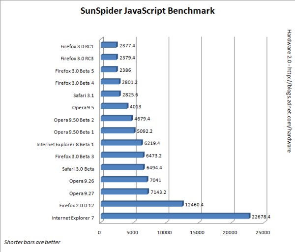 In his ZDnet blog, Adrian Kingsley-Hughes ran the SunSpider JavaScript benchmark against FireFox 3 RC1 and RC3 and compared this to his results with Opera 9.5, Safari 1.5, IE 7 and the IE 8 beta. All tests were done on the same hardware. FireFox 3 swept the Javascript benchmark. Here's the test result chart: