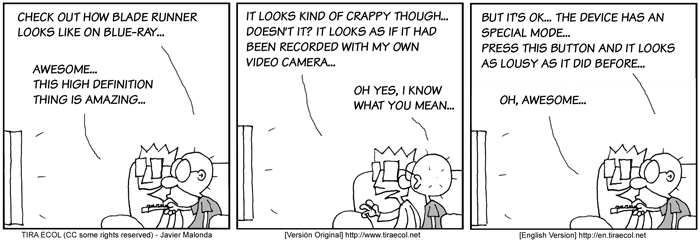 All Ecol cartoons are at tira.escomposlinux.org (Spanish), comic.escomposlinux.org (English) and http://tira.puntbarra.com/ (Catalan). The Catalan version is translated by the people who run the site; only a few episodes are currently available.These cartoons are copyright Javier Malonda. They may be copied, linked or distributed by any means. However, you may not distribute modifications. If you link to a cartoon, please notify Javier, who would appreciate hearing from you.