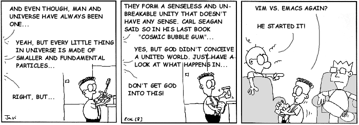 The Ecol comic strip is written for escomposlinux.org (ECOL), the web site that supports es.comp.os.linux, the Spanish USENET newsgroup for Linux. The strips are drawn in Spanish and then translated to English by the author.These images are scaled down to minimize horizontal scrolling.