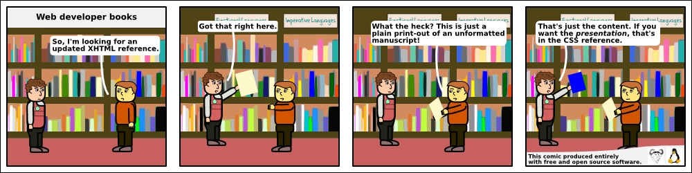 The webcomic Doomed to Obscurity was launched New Year's Day, 2009, as a "New Year's surprise". He has since rigorously stuck to a posting schedule of "every odd-numbered calendar day", which allows him to keep a steady pace without tiring. The tagline for the webcomic states that it "gives the geek culture just what it deserves." But is it skewering everybody but the geek culture, or lampooning geek culture itself, or doing both by turns?
