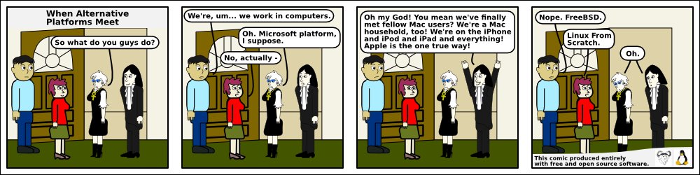 The webcomic Doomed to Obscurity was launched New Year's Day, 2009, as a "New Year's surprise". He has since rigorously stuck to a posting schedule of "every odd-numbered calendar day", which allows him to keep a steady pace without tiring. The tagline for the webcomic states that it "gives the geek culture just what it deserves." But is it skewering everybody but the geek culture, or lampooning geek culture itself, or doing both by turns?