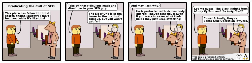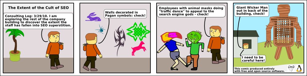 The webcomic Doomed to Obscurity was launched New Year's Day, 2009, as a "New Year's surprise". He has since rigorously stuck to a posting schedule of "every odd-numbered calendar day", which allows him to keep a steady pace without tiring. The tagline for the webcomic states that it "gives the geek culture just what it deserves." But is it skewering everybody but the geek culture, or lampooning geek culture itself, or doing both by turns?