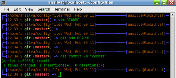 In this screenshot, my prompt tells me what vcs I am using, git, in which branch of the repository I have currently checked out, master, and in what stage of the commit is currently being displayed. The yellow asterisk ‘*’, means I have modified a file.
