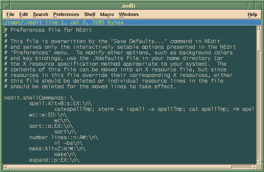 One useful feature is Nedit's use of the X clipboard, rather than an internal private clip-buffer. This opens up the possibility of using the venerable but still useful utility, xclipboard, which is usually part of the default installation of a Linux distribution. Xclipboard is a multiple sliding clipboard utility (a new clip pushes the previous one down one level in the stack), and the contents of this clipboard are available to any other X program with that capability. A surprising number of editors don't have this ability, Gnu Emacs being an obvious example.(Or does it? Let me know if there is a way!). Netscape uses the X clipboard, which leads me to surmise that there is something in the Motif libraries which facilitates the clipboard's use.