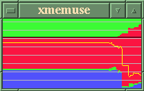 Harm ArtsThis is an Xmemuse window running in a well-loaded Linux session, with Netscape, Emacs, and several other applications running in different virtual desktops. The free swap space is at the top; you can see this begin to diminish as the programs are started.