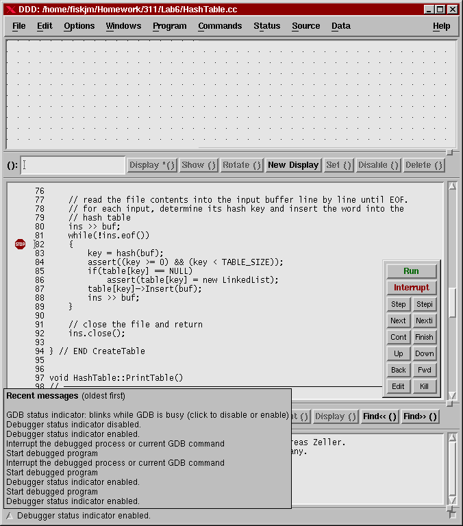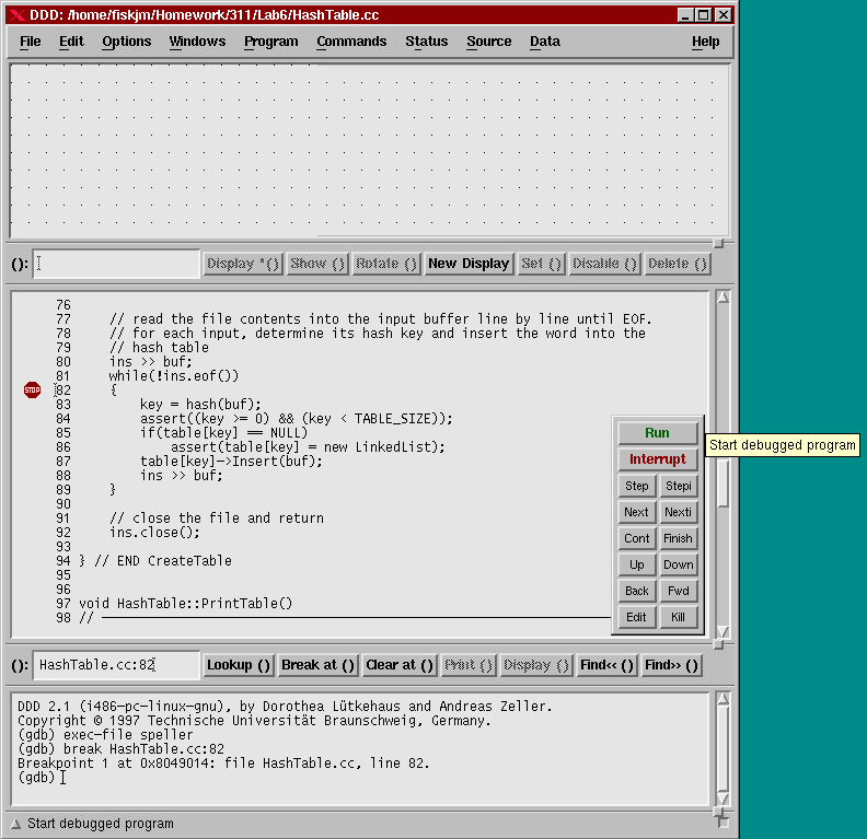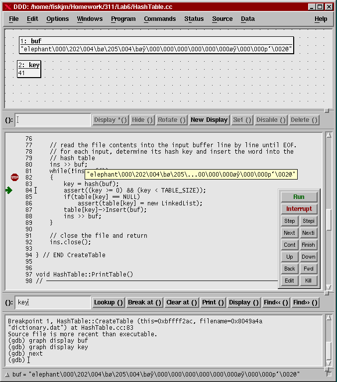 I've not had a chance to use the new DDD debugger as much as xxgdb, but what I've tried I'm been VERY impressed with. You'll see from the screen shots above that it has a much improved GUI as compared to xxgdb. Also, a number of new features have been added since the previous 1.4 release. One feature that I really like is setting a breakpoint, running the program, and then, by positioning the mouse pointer over a variable or data structure, getting a pop up balloon with the current value of that data structure.