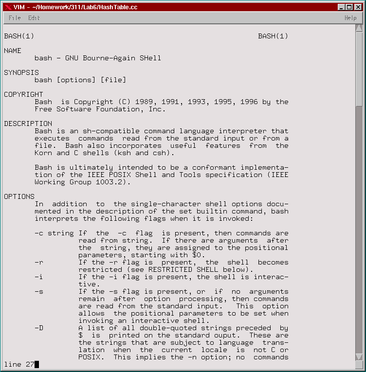 What I was going to say was that vim also provides syntax highlighting for shell scripts (VERY COOL!), makefiles, and the VIM help files (which you'll see here in just a bit). All in all, this is pretty nice. I've been tinkering around with this a bit and am really starting to like it. Be aware that the highlighting isn't quite as "intelligent" as with something like XEmacs -- it doesn't provide the same degree of sophistication. Still, it's very good and, being an order of magnitude smaller and a good deal more nimble, it's well worth trying.