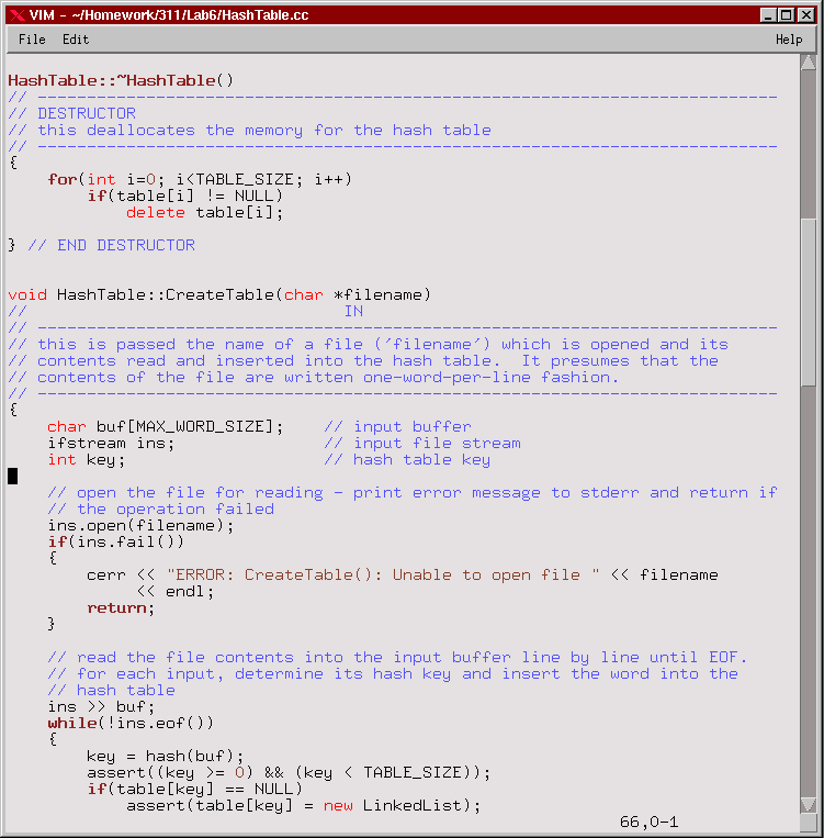 Again, I've included screen dumps below so that you can see what this looks like. In addition, the VIM home page has a couple nice screen shots that you might want to have a look at. I should add that syntax highlighting is individually configurable for the console and the X version. Now, before you go dashing off and "rushing in where angels fear to tread..." you will probably want to have a look at the help files or documentation -- it gives some basic guidelines for customizing this stuff.