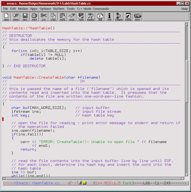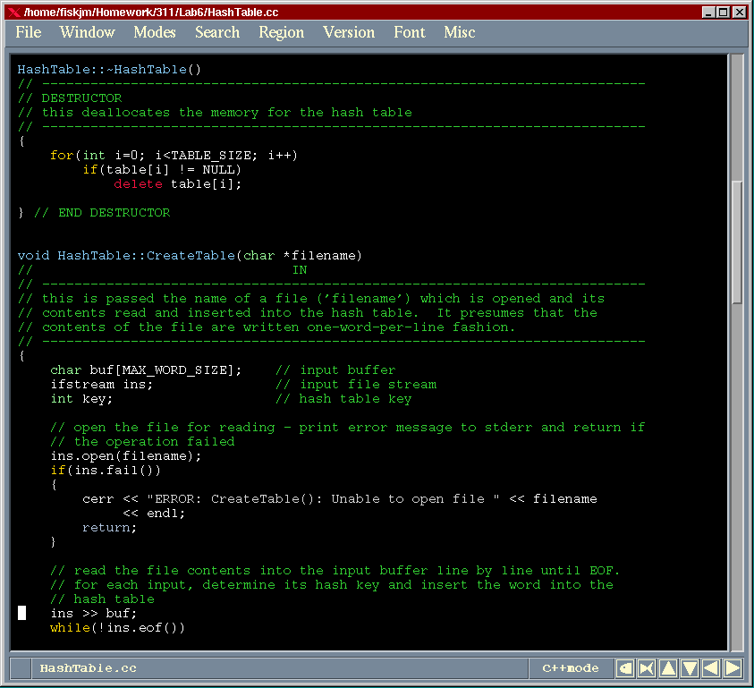 VIM Programming PerksWell, as I mentioned above, I ended up spending a good deal of time programming this semester. Our software engineering team designed and coded a simple FORTRAN 77 spell checker in C++. Thing was, the analysis and design phase consumed 11 of the 14 weeks of the semester AND it was done using Structured Analysis. Problem was, we had decided to code this thing in C++ and so ended up almost completely redesigning it using OO Analysis and Design during the last couple weeks (when we were supposed to be doing nothing but coding :-).