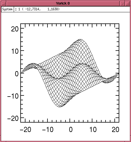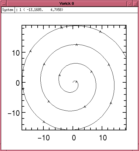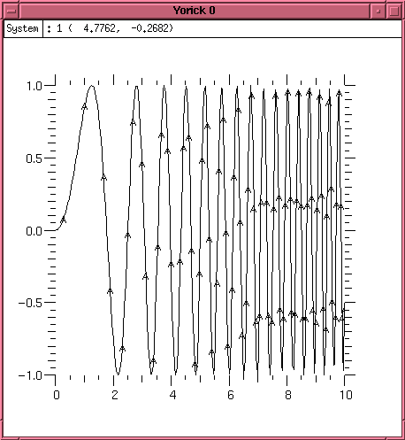 Under Linux, Yorick is linked with the GIST graphics subsystem, allowing immediate display of plots and diagrams. Plots are interactive, allowing the user to zoom in and out, stretch axes, and crop the displays using the mouse. Yorick is capable of displaying sequences of plots over time as a move, and because of this the command to prepare for a new image is fma, or frame advance. Onward.