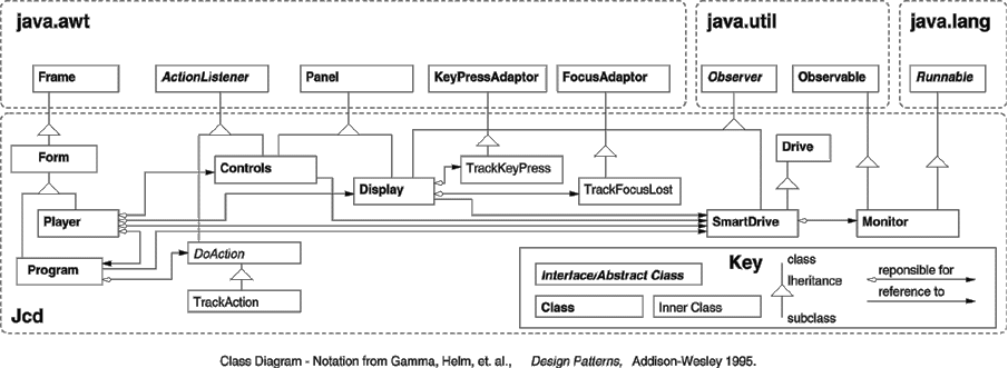 + programListing - a text field; + trackPanel - a grid of track buttons; + and buttonPanel - a row of control buttons.The program class isn't really any more complex than the rest of the GUI except that it features quite extensive use of Inner Classes and Anonymous Classes newly introduced in Java 1.1. Most of the following description will concentrate on these two new language features.