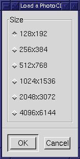128x192To read this format you have a couple of options. First, the Gimp has a PhotoCD file plug-in. You can tell if you have this plug-in installed if you try to open an existing file and the Open Options menu includes an entry for PCD. If you try to open a file from the CD by double clicking on the filename in the Load Image dialog then the plug-in is started and you get the dialog shown at left. You'll notice that this plug-in offers the additional resolution of 4096x6144. I'm not certain if this is a valid PhotoCD resolution or not, but it didn't seem to matter. Unfortunately, I was unable to read any of the images from the CD in resolutions higher than 512x768 using this plug-in. I had to switch to an alternative option, the hpcdtoppm tool from NetPBM package. With this program I could read the higher resolutions - up to 2048x3072 - into a PPM formatted file which I could then load into the Gimp. I didn't have time to determine if the problem was with the Gimp plug-in or the CDs, but I suspect the plug-in is at fault since I could read the higher resolutions with hpcdtoppm. Note that this plug-in works fine for resolutions up to 512x768.