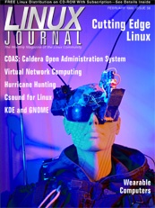 The February issue of Linux Journal will be hitting the newsstands January 11. This issue focuses on Cutting Edge Linux with an article on wearable computers by Dr. Steve Mann. Also, featured are articles on COAS, Csound, VNC, KDE and GNOME. Check out the Table of Contents at http://www.linuxjournal.com/issue58/index.html. To subscribe to Linux Journal, go to http://www.linuxjournal.com/ljsubsorder.html.