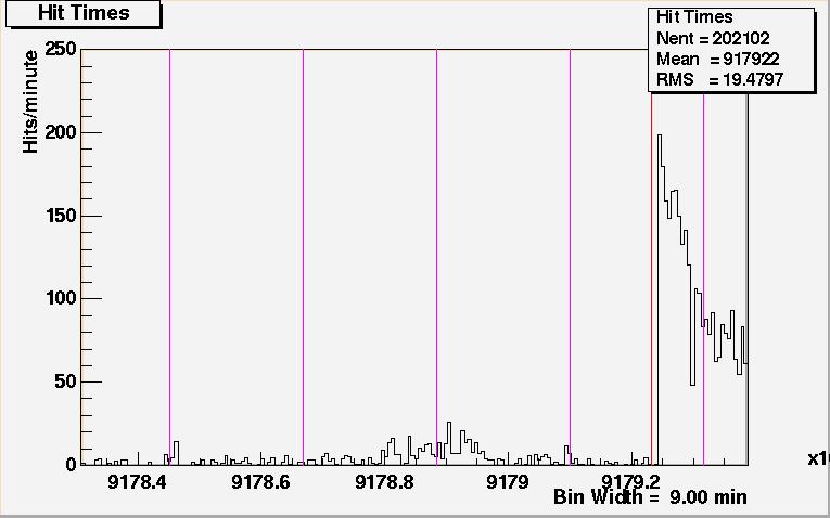 What follows is a table of plots of the same data but on a finer time scale. (9 min/bin as opposed to 50 min/bin in the plot in Figure 1.) The purpose is for one to better study the data. The purple lines are now time marker on 6 hour intervals. The limits on the time axis overlap between plots to help the reader follow the continuity of the data. Because of binning effects, the overlap regions of the data from one plot to the next look slightly different, and this dissimilarity should be ignored.