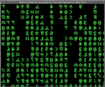 Watching the ever streaming line of announcements over at freshmeat, I noticed an announcement for something called cmatrix. It was said to be a screensaver in the style of The Matrix, that wonderfully confusing cinema fantasy starring Keanu Reeves. Unfortunately, it's not an X-based program. It runs under Curses, a terminal based graphical interface. Then I saw that Jamie Zawinsky, late of Netscape, had added a Matrix hack to his xscreensaver program. So I scrounged around a bit and found xscreensaver, downloaded it and put it to work.