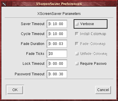 All of the options in the .xscreensaver configuration file use a name:token format. That is, you specify the name of the option, followed by a colon and the setting for that option. Since the configuration option uses the same option names as the X Resources file, you can also place these settings in your .Xdefaults file if you like. I prefer using program specific files like .xscreensaver because if I screw up that one file I don't take the chance of breaking some other program like I might if I used my .Xdefaults file instead.