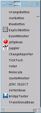 The ToolBox initially contains a number of example beans, you can add your own to create your own visual programming environment. Select a bean by clicking your mouse on it. Then click somewhere in the BeanBox. The javaBean will appear and a list of its properties will appear in the Properties window. You may then use the Properties window to customize the JavaBean for your application. When you have finished adding Beans, and are happy with the appearance of your application in the BeanBox you can select File/Make applet from the BeanBox windows menu and an applet complete with example html file will be generated for you.