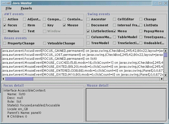Accessibility Monitor Accessibility Monitor will monitor all accessible property change events on all of the non-transient objects in the virtual machine. In addition, if the user clicks the right mouse over the events presented in the table provided by AccessibilityMonitor, AccessibilityMonitor will present the user with a pop-up menu containing options for manipulating the associated object.