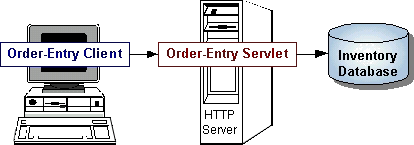 The diagram above shows a typical use of a Java servlet. A HTTP server is running a servlet that is responsible for taking data from a HTML order-entry form and applies a companies rules for updating their order database. Simply put, a java servlet is a servers version of a java applet. As one might expect, since the server will be running remotely and unattended (from a users viewpoint at least) servlet's have no graphical user interface.