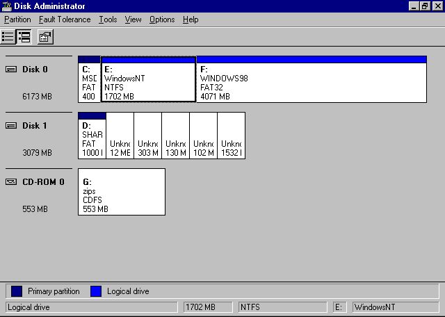 You can see the end result of my partition scheme (using the NT Disk Administrator to make it all look nice) here. The Unknown partitions are EXT2 Linux partitions. NT cannot identify them.