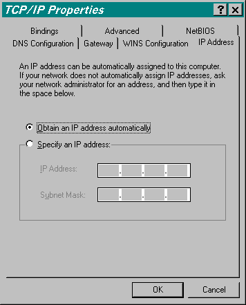 Start -> Settings -> Control Panel -> NetworkFind the `TCP/IP protocol for your network adapter'. Highlight it get to the properties window by pressing [Mouse1] on the `Properties' button. Since pictures are better than words I'll use the following 3 pictures to illustrate how your TCP/IP settings should be configured: