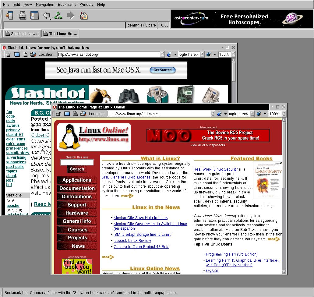 Ported from the Windows world, Opera seems to fill the gap. It's still not a full replacement for Netscape on the Linux platform, but it's very close to reaching this goal.