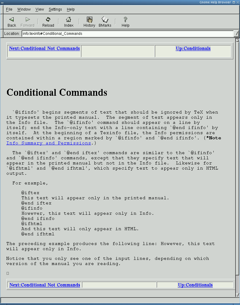 Texinfo differs from all the document preparation systems that we have had a look at so far, for Texinfo can be translated in an online viewing format different from HTML, namely: Info. Having an online viewing format, we need browsers to actually view it!