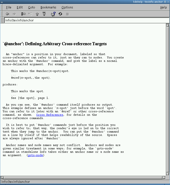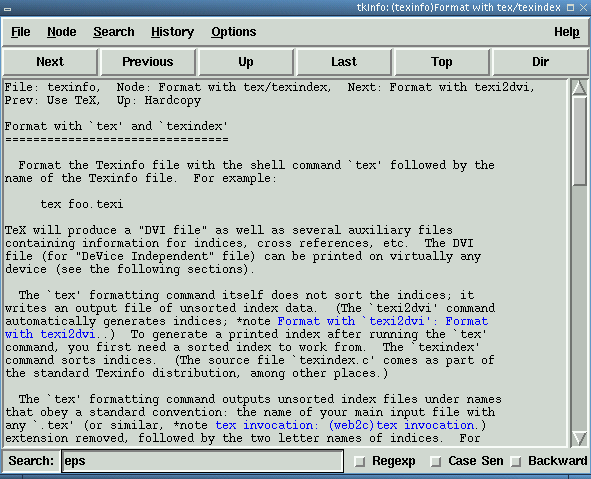 The major design goal of the Texinfo format is to produce high quality printed output as well as online browsable output from the same source (.texi) file. Texinfo obtains the basis for a high quality hardcopy with a trick: it builds on plain TeX and adapts it by reading the file texinfo.tex (Your system might have more than one copy of this file. Check that you are really using a recent version (2002-01-04.07 as of this writing)). texinfo.tex does all the necessary formatting setup. It extends TeX to recognize hyper-references and all the gizmos that is needed for online documentation. Rendered for online viewing, Texinfo source yields Info (.info) files.