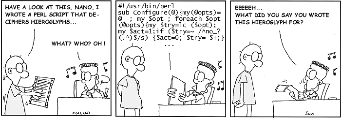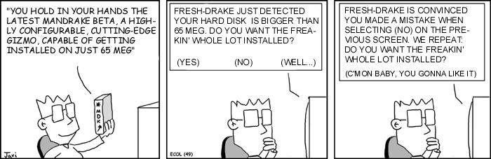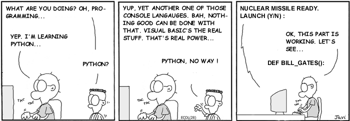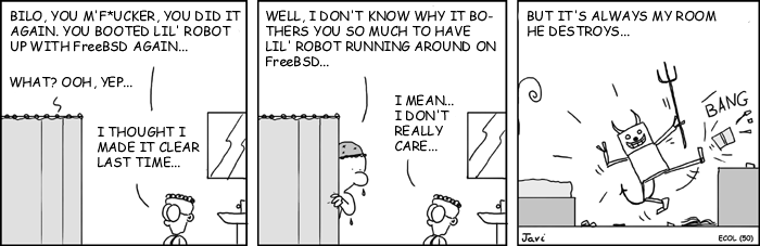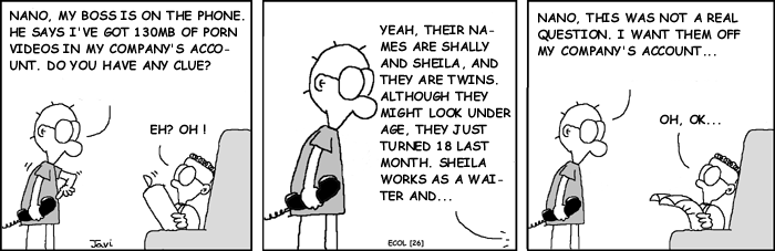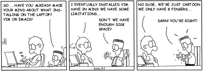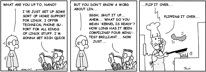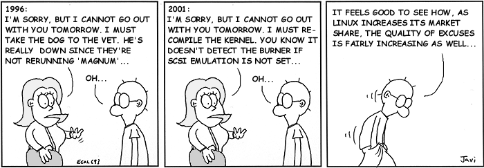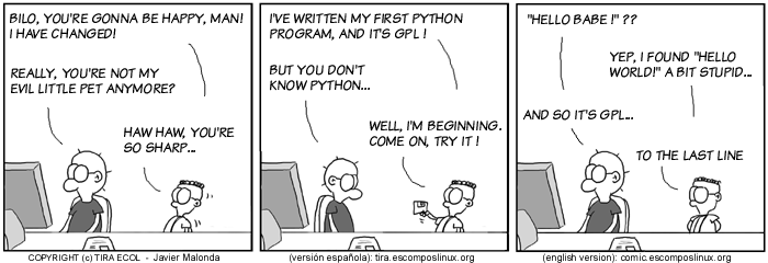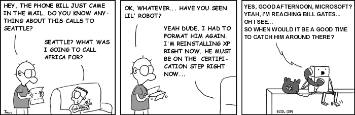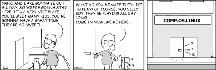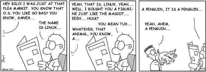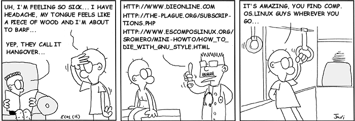 Hi. I am a member of escomposlinux.org, an organization supporting the es.comp.os.linux.* newsgroups. Some years ago, a fellow member had the wonderful idea of drawing a weekly comic strip based on linux.Here are a few of the best cartoons since the comic started in January 2001.Well, recently, the strip has been translated into English (ajem, we are doing our best ;-)