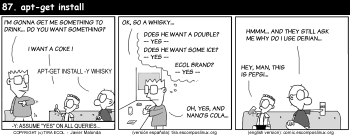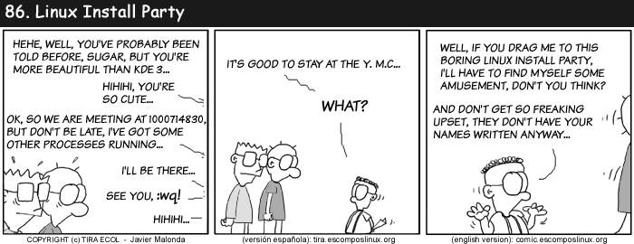 These cartoons were made for es.comp.os.linux (ECOL), the Spanish USENET newsgroup for Linux. The strips are drawn in Spanish and then translated to English by the author. Text commentary on this page is by LG Editor Iron. Your browser has shrunk the images to conform to the horizontal size limit for LG articles. For better picture quality, click on each cartoon to see it full size.