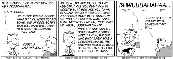 The Ecol comic strip is written for escomposlinux.org (ECOL), the web site tha t supports, es.comp.os.linux, the Spanish USENET newsgroup for Linux. The strips are drawn in Spanish and then translated to English by the author.