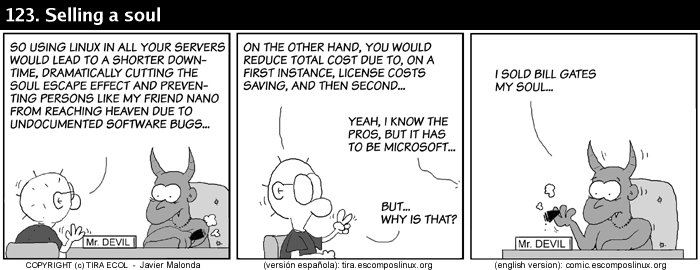 The Ecol comic strip is written for escomposlinux.org (ECOL), the web site tha t supports, es.comp.os.linux, the Spanish USENET newsgroup for Linux. The strips are drawn in Spanish and then translated to English by the author.